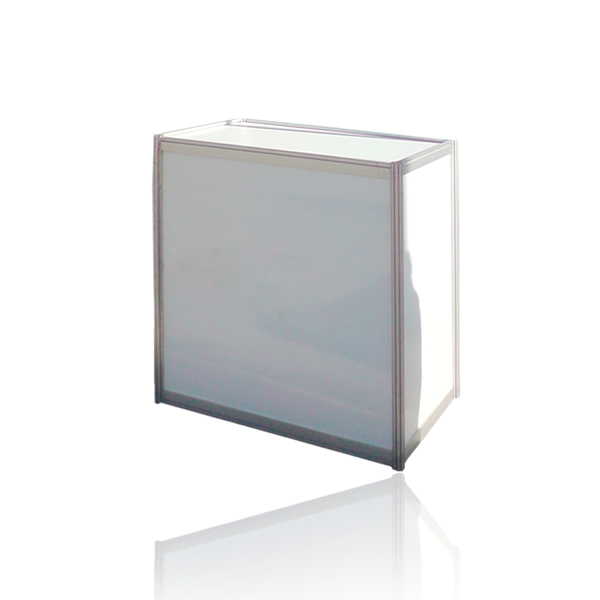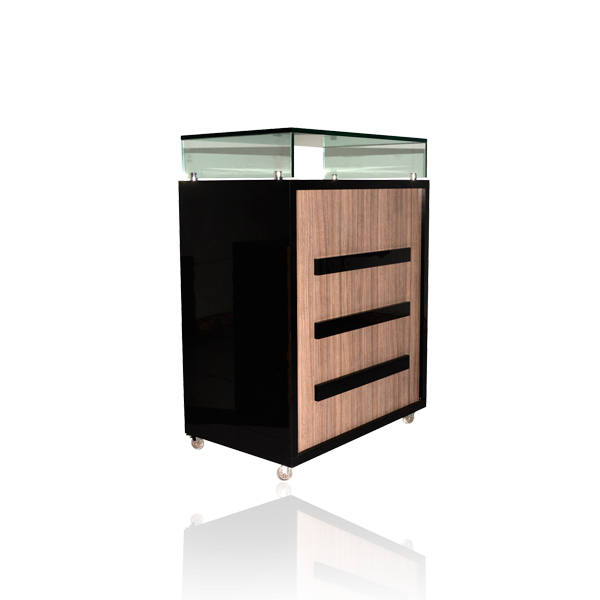 Em vidro e madeira com gaveta.